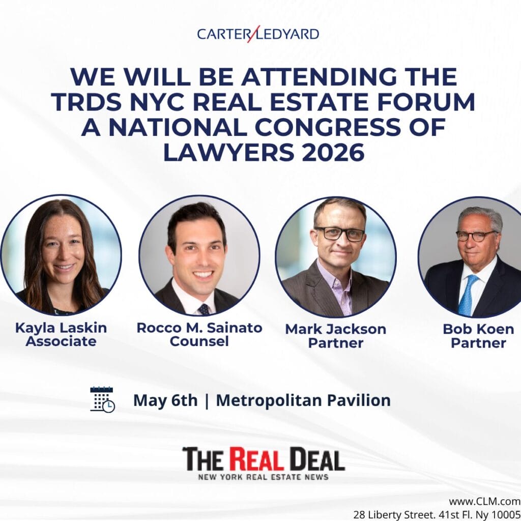Partner Robert G. Koen, Partner Mark D. Jackson, Counsel Rocco M. Sainato, and Associate Kayla Laskin will be attending the The Real Deal New York City New York City Real Estate Forum on Wednesday, May 6th, 2026.